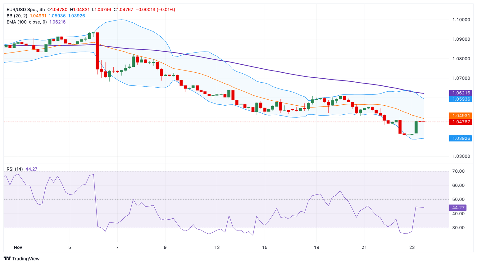 On the bright side, the first upside barrier is seen at 1.0545, the high of November 21. The next hurdle is located near the upper boundary of the Bollinger Band at 1.0591. The crucial resistance level emerges at 1.0621, the 100-period EMA.
