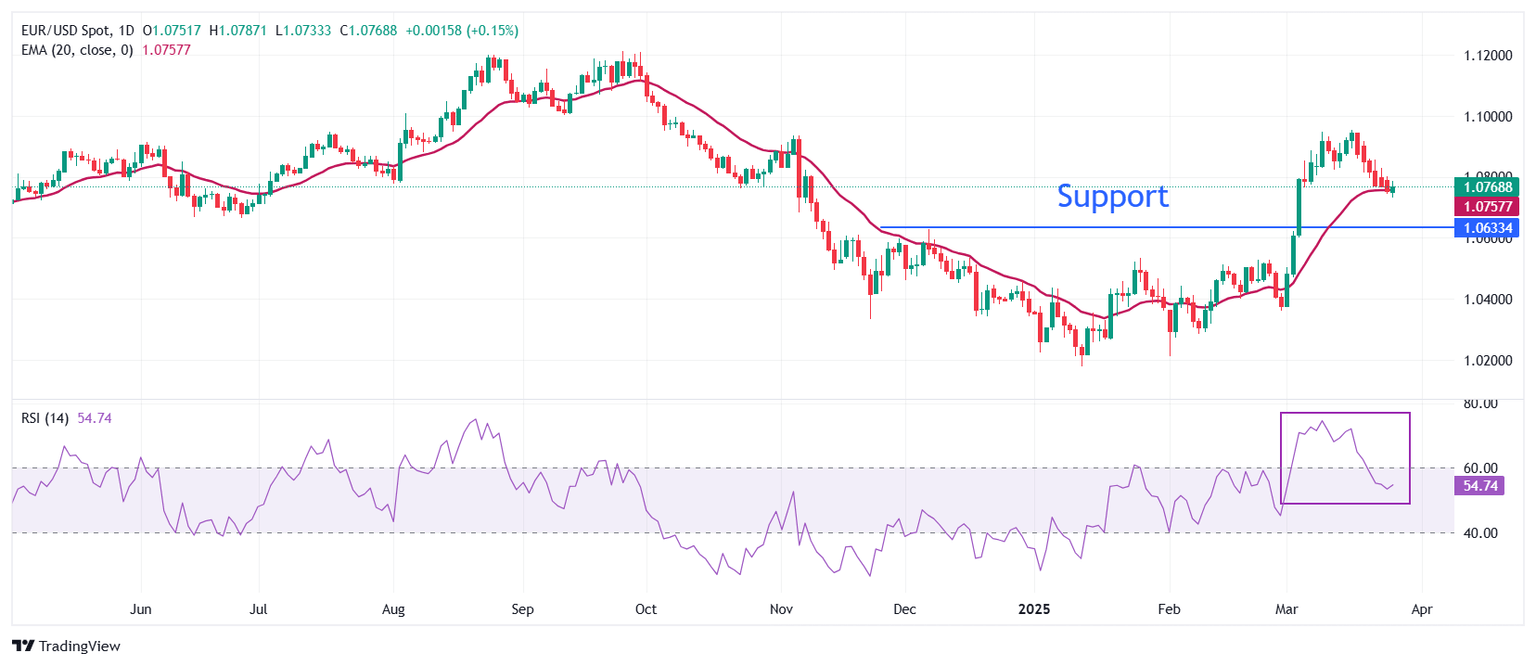 EUR/USD attracts bids after posting a fresh three-week low near 1.0730, which coincided with the 20-day Exponential Moving Average (EMA) earlier in the day.