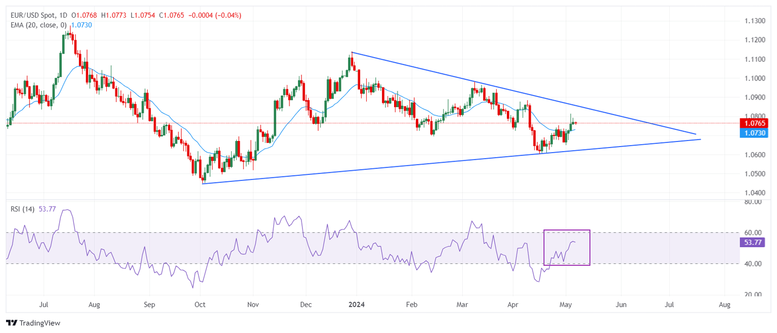 EUR/USD trades in a narrow range around 1.0770. The major currency pair struggles for a direction amid an absence of top-tier economic events. The overall trend in the major is also sideways due to a Symmetrical Triangle formation on a daily timeframe.