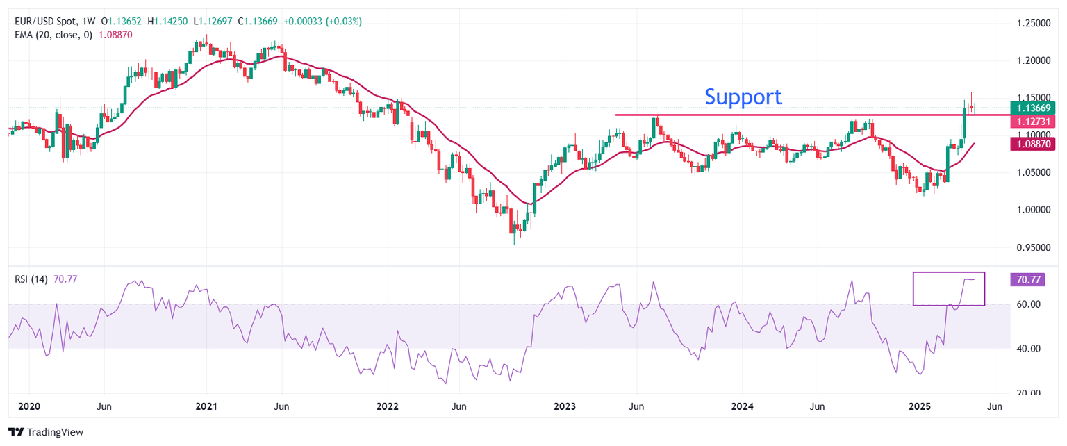 EUR/USD slips to near 1.1350 in Wednesday’s North American session. The outlook of the major currency pair remains bullish as the 20-week Exponential Moving Average (EMA) is sloping higher around 1.0890.