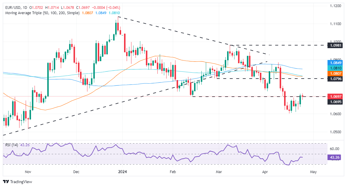 The Euro is steady against the US Dollar, virtually unchanged after solid data from the United States (US) boosted the Greenback, which recovered from Tuesday's losses. However, the EUR/USD stands below the 1.0700 threshold posting minimal gains of 0.01%.