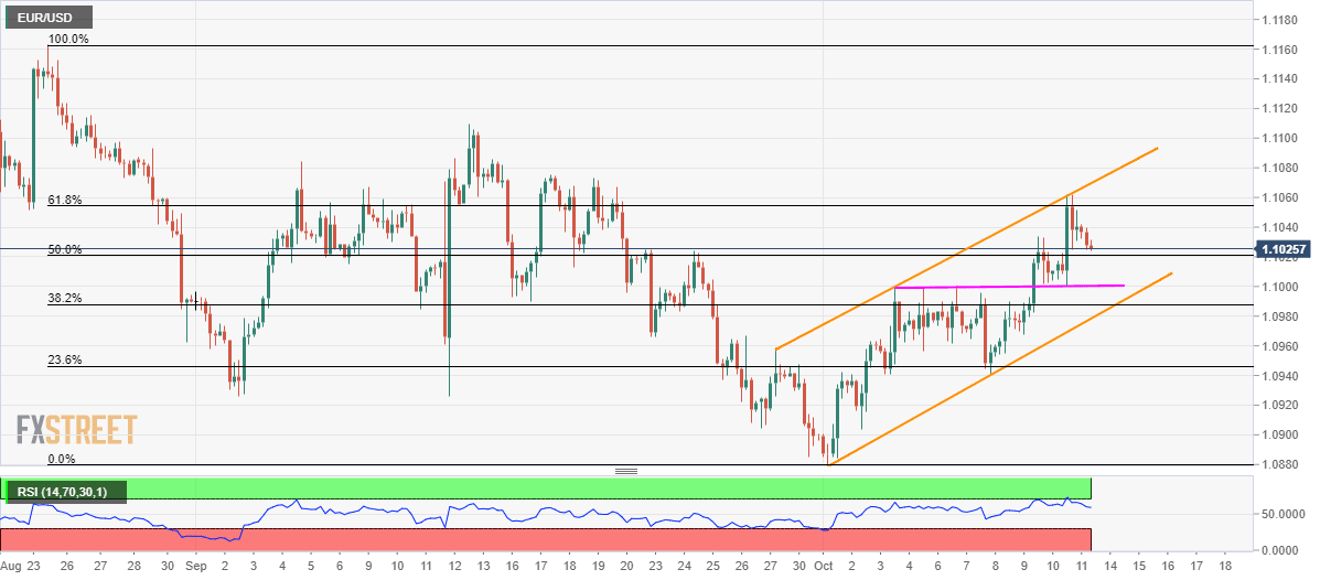 Despite witnessing a pullback from 61.8% Fibonacci retracement of late-August to September month declines, the EUR/USD pair stays inside a short-term rising channel as it trades near 1.1027 during early Monday.