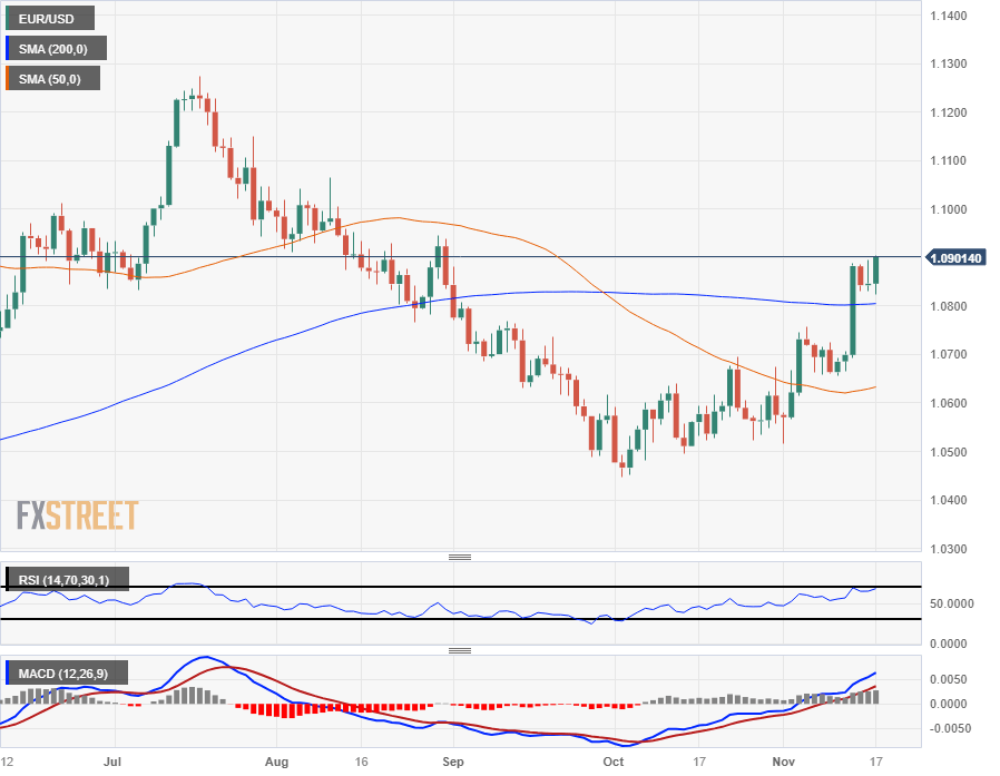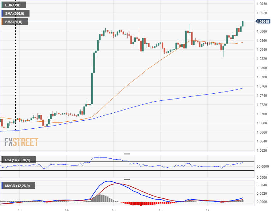 The EUR/USD's Friday risk-on rally sees the pair testing chart territory at the 1.0900 handle, pushing into fresh highs for the week ahead of the closing bell.