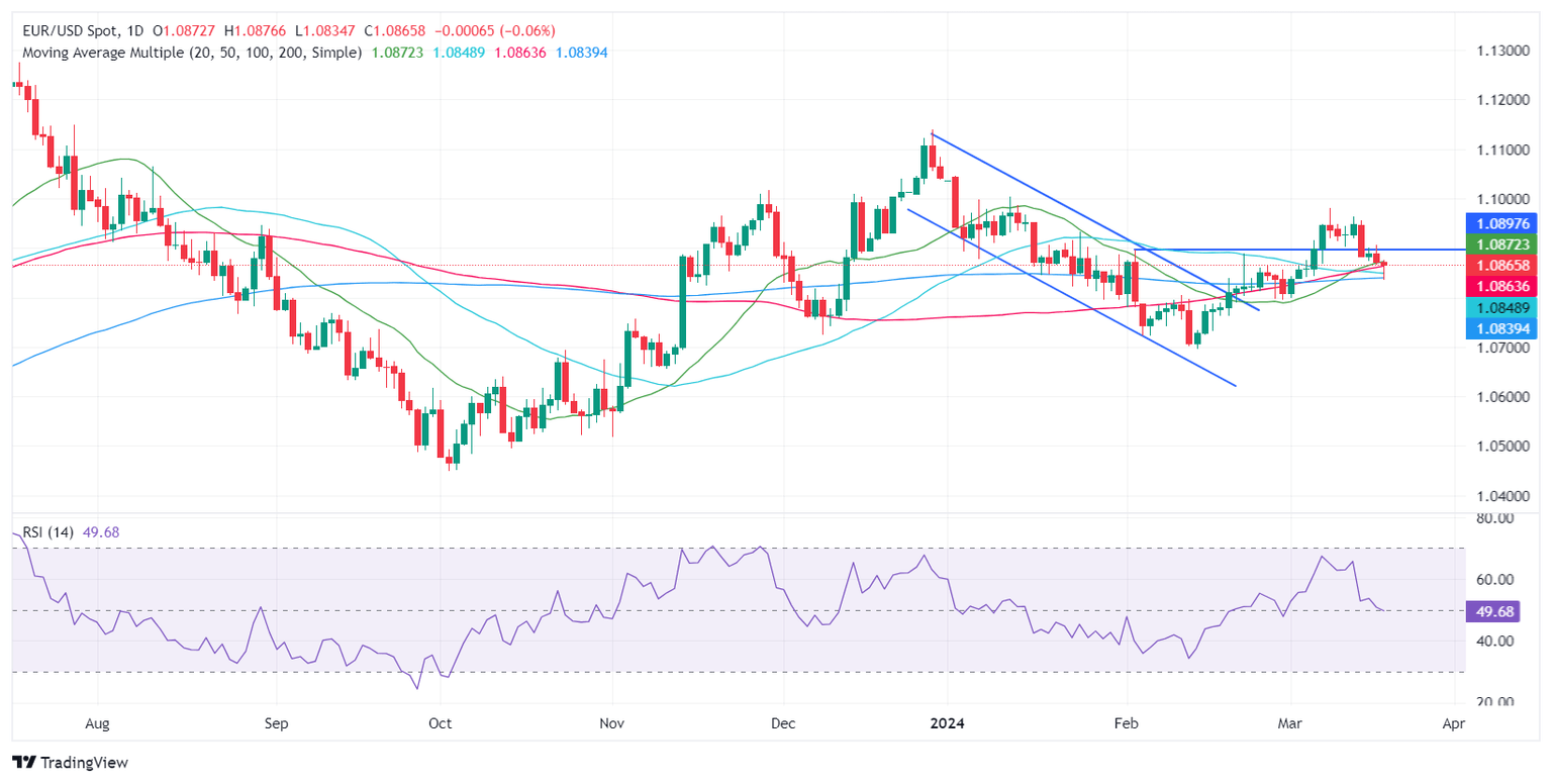 The EUR/USD daily chart suggests the pair is neutral to downward biased, though dynamic support levels like the 200, 100, and 50-day moving averages (DMAs) capped the Euro’s losses, opening the door for a recovery. If buyers lift the exchange rate above 1.0900, it could expose the March 13 high at 1.0964. followed by the year-to-date (YTD) high at 1.0981. On the other hand, sellers need to push prices below the 200-DMA at 1.0838, so they could threaten to challenge 1.0800.