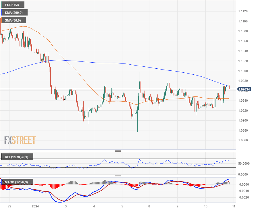 Despite bullish intraday momentum, the EUR/USD is set for a near-term rejection of the 200-hour Simple Moving Average (SMA), running into a technical ceiling at the top of a recent sideways channel forming on intraday charts between 1.0970 and 1.0910.