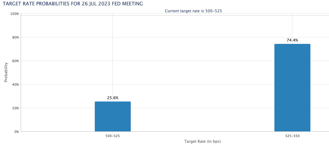 On the latter, it is worth mentioning that the ECB Christine Lagarde, as well as many of her colleagues at the Governing Council, already advocated for an extra quarter-point rate raise in July, while Chief Jerome Powell also left the door open to a similar move at the July 26 gathering. This scenario is favoured with nearly 75% of probability according to CME Group’s FedWatch Tool.