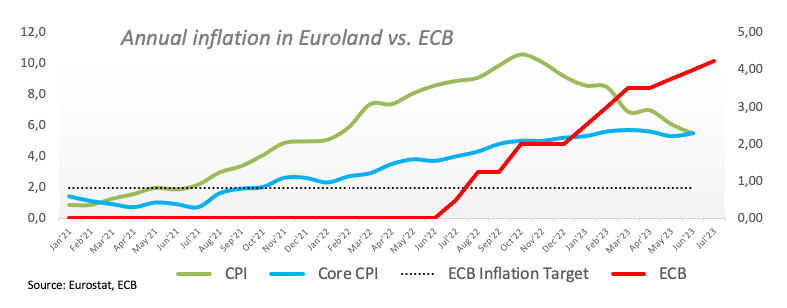 The pair saw its early uptick trimmed after the European Central Bank (ECB) raised its policy rates by 25 bps. From the bank's statement, interest rate decisions will be based on inflation outlook, economic and financial data, underlying inflation dynamics, and monetary policy transmission. In addition, the Coucil will set restrictive interest rates to achieve a 2% medium-term target, ensuring a timely return of inflation to the target. The data-dependent approach will continue to guide future decisions.