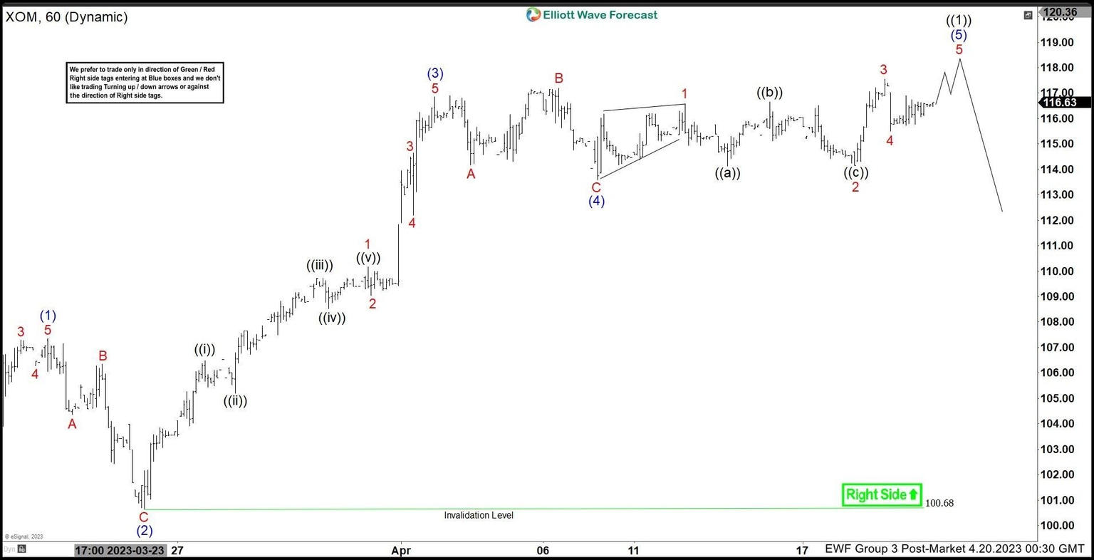 Exxon Mobil (XOM) cycle from 3.20.2023 low is in progress as a 5 waves impulse Elliott Wave structure. Up from 3.20.2023 low, wave (1) ended at 107.35 and pullback in wave 2 ended at 100.68 as the 1-hour chart below shows. Up from there, wave 1 ended at 110.17 and wave 2 ended at 109.05. Wave 3 ended at 114.64, wave 4 ended at 112.20. Final wave 5 ended at 116.85 which completed wave (3) in higher degree.
