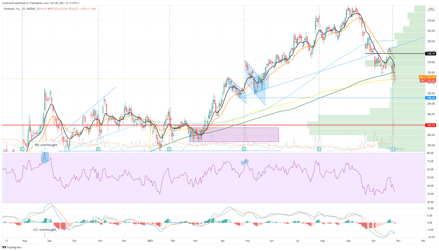 FB shares have now retreated to the yearly Volume Weighted Average Price (VWAP) and 200-day moving average, so this may provide some support. However, the Moving Average Convergence Divergence (MACD) has just crossed and given a bearish signal. Previous lows at $298 and $295 provide some support, but $280 to $260 is the real strong support in volume terms.