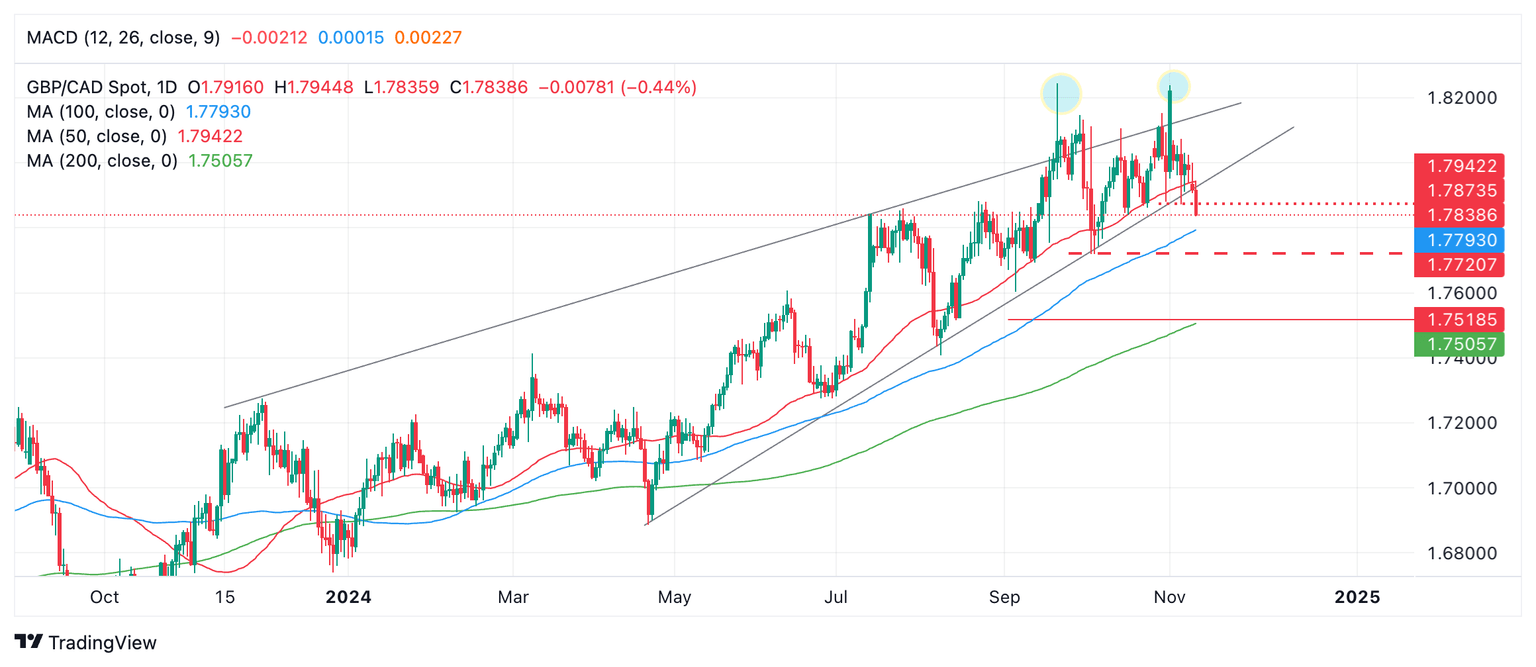 - GBP/CAD is breaking out of its Rising Wedge pattern and declining.