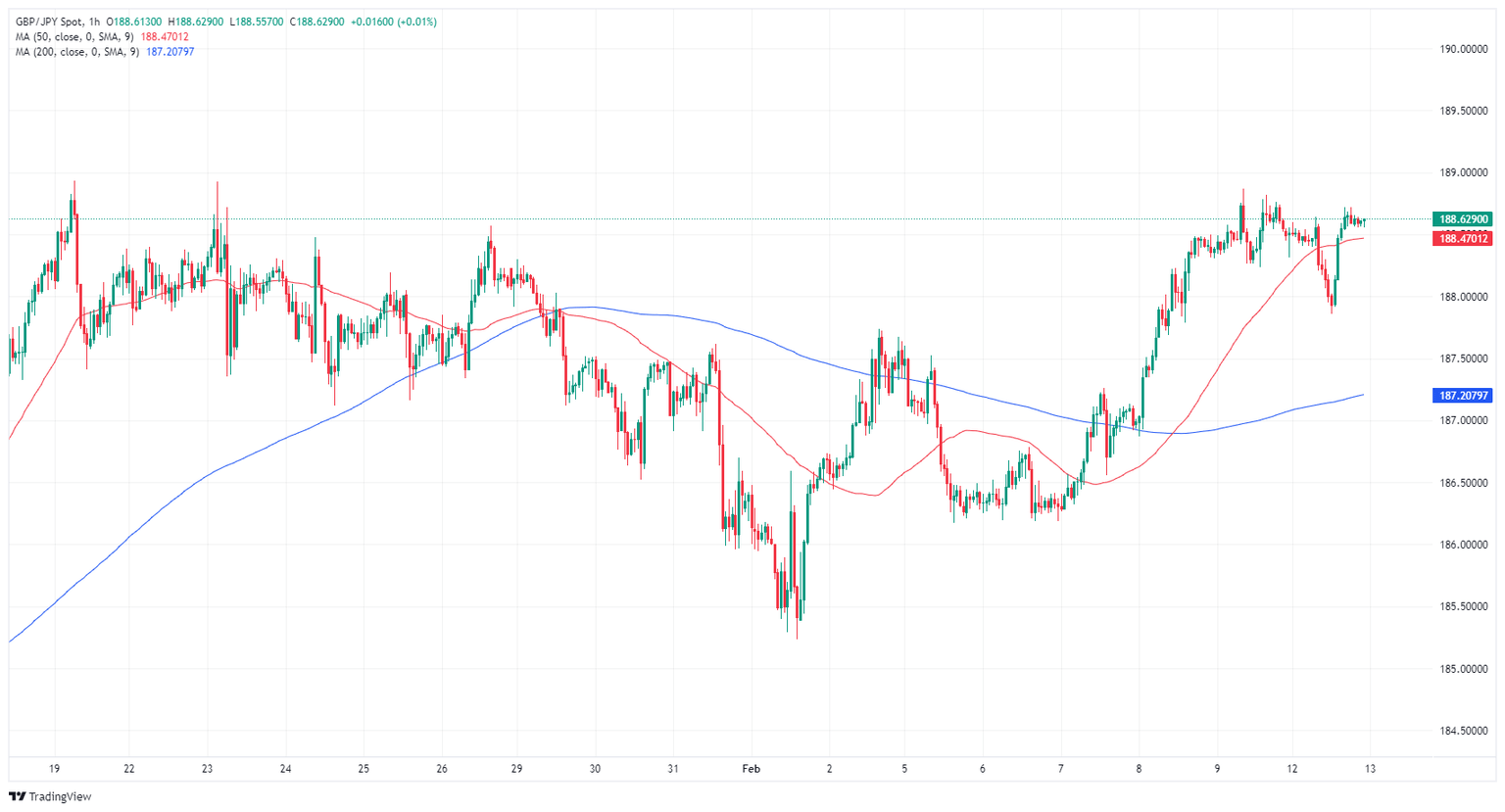 GBP/JPY remains well-supported with the pair continuing to trade on the high side of the 200-hour Simple Moving Average (SMA) near 187.20. The pair broke through the near-term median technical barrier last week and has climbed nearly 2% from February’s early lows near 185.25.