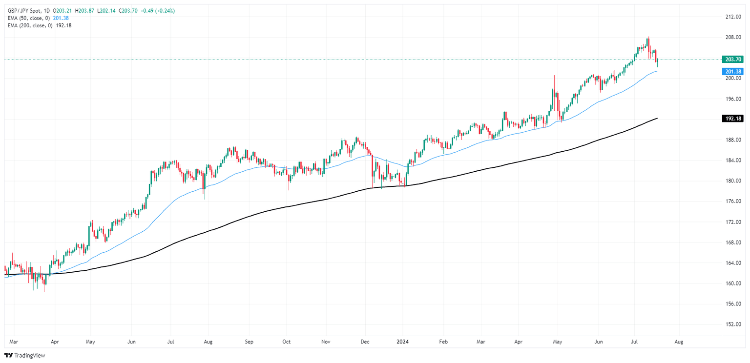 Daily candles are holding above the 50-day EMA at 201.38, and despite suspected “Yenterventions”, the pair is still trading firmly into 16-year highs. Bids are trading well above the 200-day EMA at 192.18.