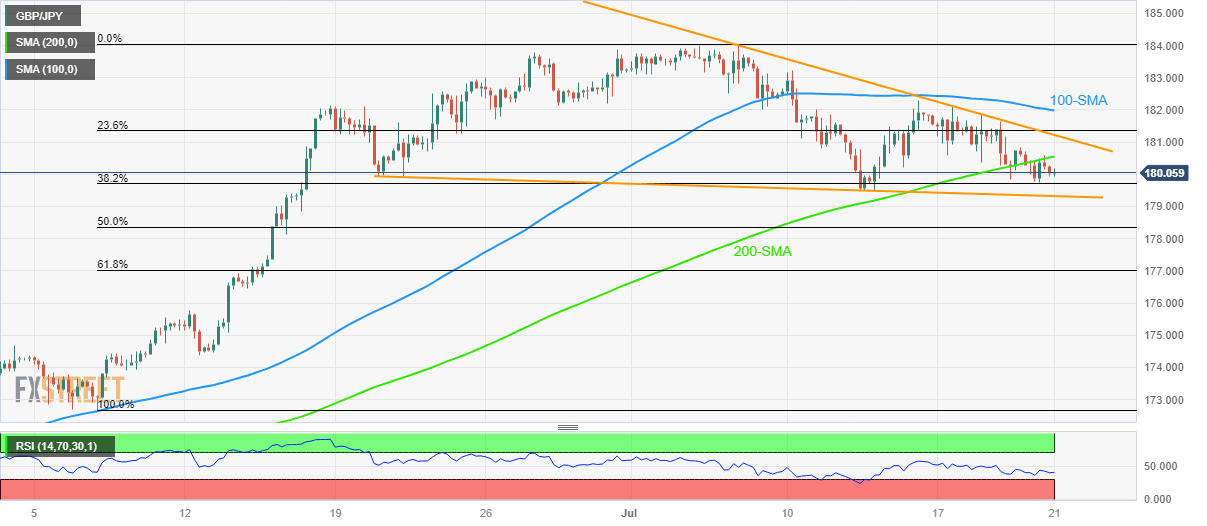 GBP/JPY licks its wounds at the weekly low, mildly offered near 180.20 amid early Friday in Asia, as it prints the five-day losing streak. In doing so, the cross-currency pair fails to justify the downside RSI conditions while staying within a one-month-old falling wedge bullish chart formation.