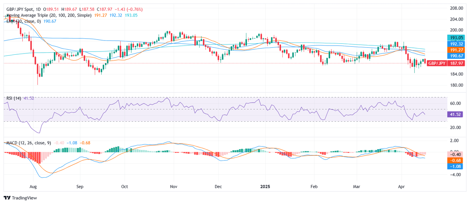 The GBP/JPY pair continued to edge lower on Wednesday, falling toward the 188 zone and marking a daily decline of nearly 0.9%. The cross remains anchored near the bottom of its range between 187.668 and 189.664, reinforcing the weight of recent selling pressure.
