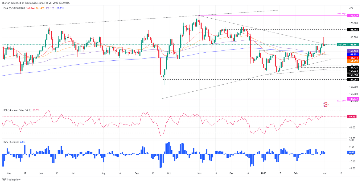 Hence, the GBP/JPY first support would be the February 28 daily low of 163.58, which, once cleared, would exacerbate a fall toward the weekly low of 162.59. A breach of the latter would send the GBP/JPY toward the confluence of the 100 and the 20-day Exponential Moving Averages (EMAs) at around 161.89/74, respectively.