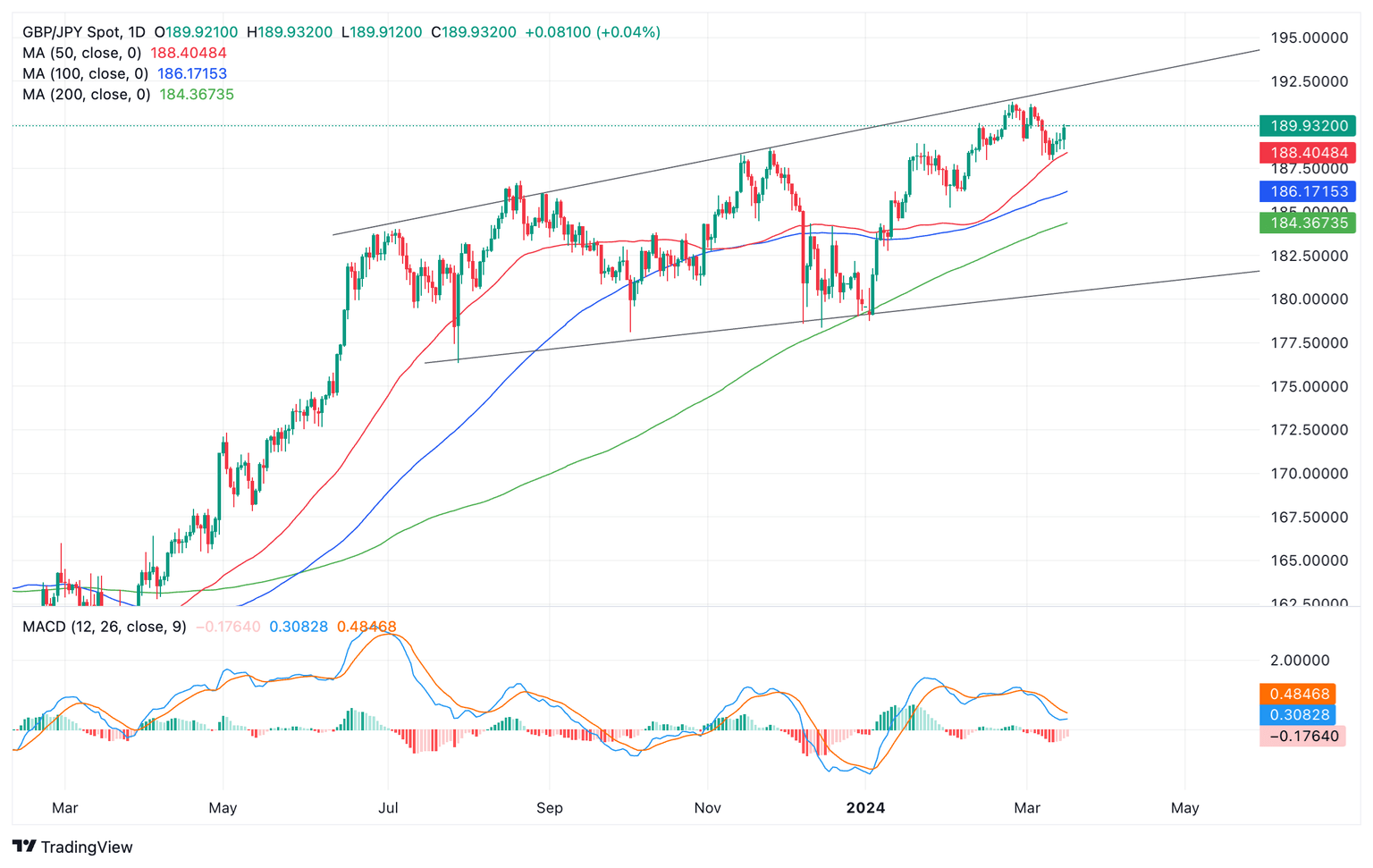 Such a move would probably see GBP/JPY fall to support near the 50-week Simple Moving Average (SMA) at 181.60.