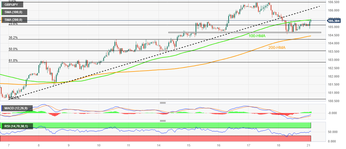 GBP/JPY picks up bids to refresh intraday high near 185.45 as bulls attack the 100-Hour Moving Average (HMA) during the first positive day in three amid early Monday. In doing so, the cross-currency pair extends the previous day’s rebound from a one-week-old horizontal support area to poke the key moving average.