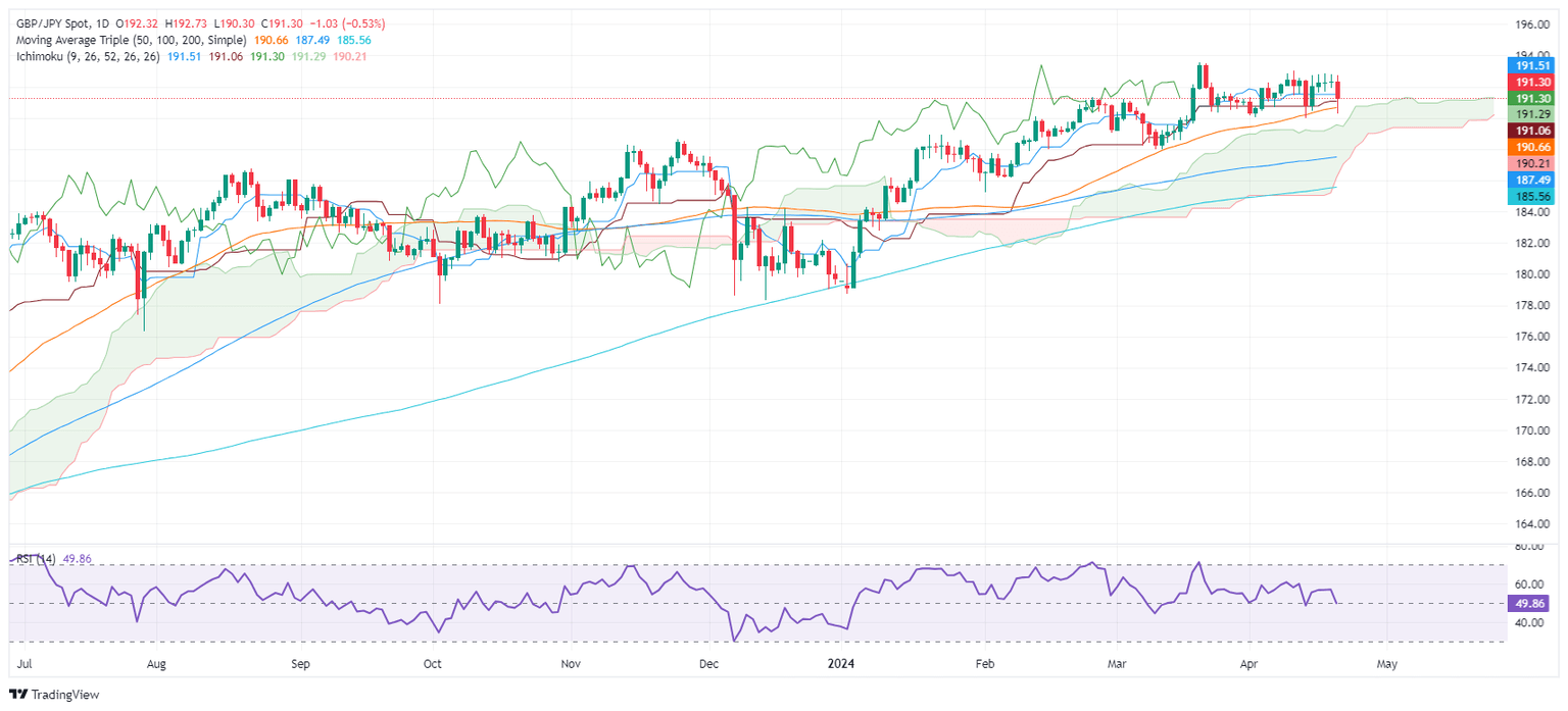 The GBP/JPY remains above the Ichimoku Cloud (Kumo), suggesting the pair is bullish. Despite sliding below key support levels, like the Tenkan and Kijun Sen, the 50-day moving average (DMA), and hitting a daily low of 190.29, the pair resumed its recovery to the current exchange rates.