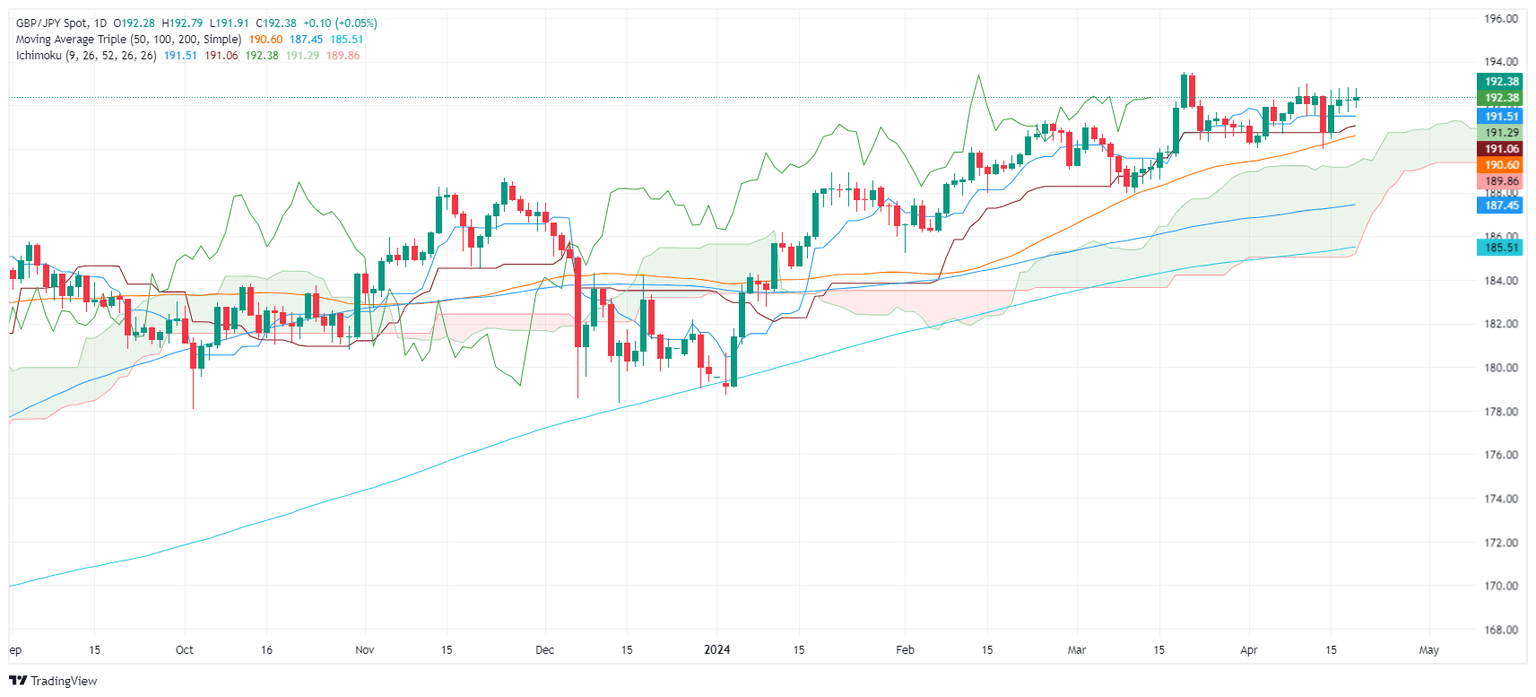 The GBP/JPY remains above the Ichimoku Cloud (Kumo), suggesting the pair is bullish. However, it is consolidating as the distance between the Senkou Span A and B shrank, the same case with the Tenkan and Kijun-Sen levels, standing beneath the price action, at 191.46 and 191.06, respectively.