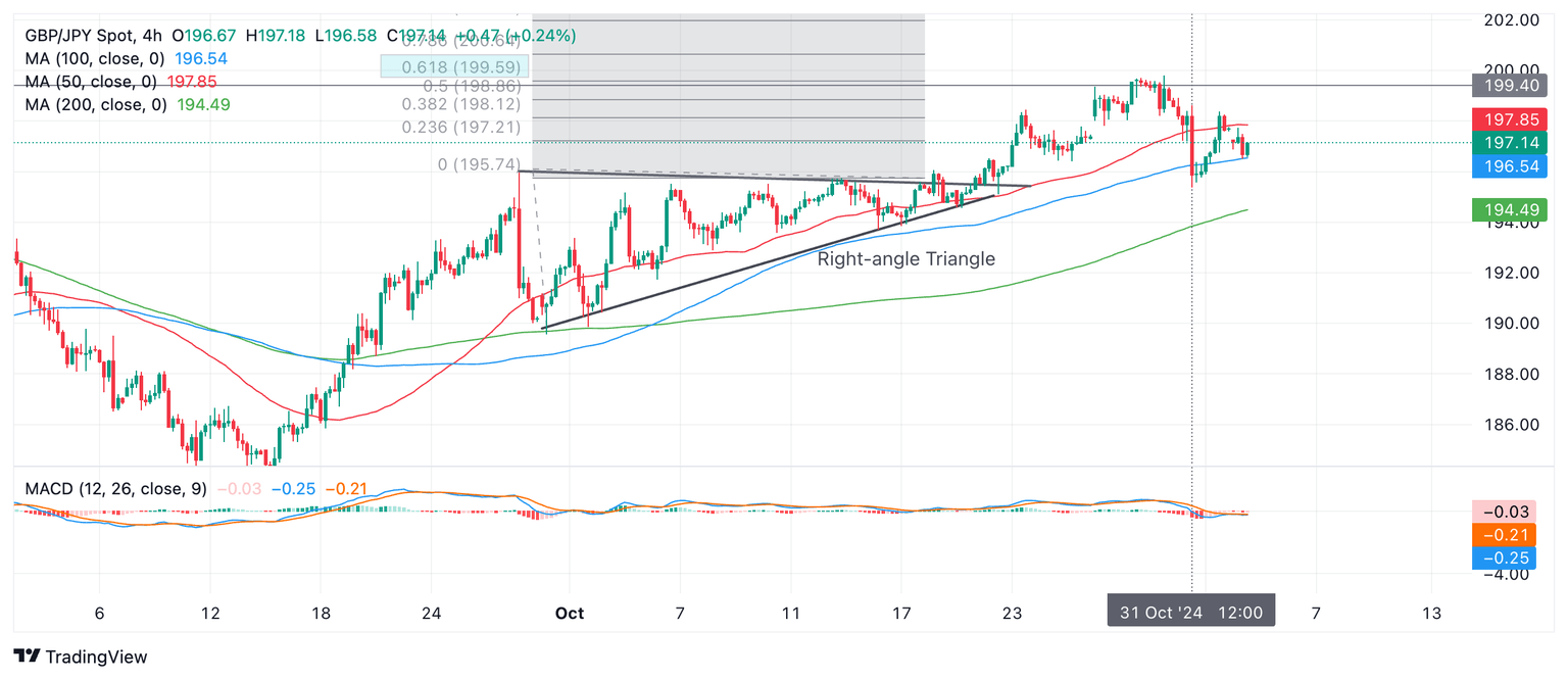 GBP/JPY rose up after breaking out of the Right-Angle Triangle it formed during October and reached the minimum price expectation for price pattern, at 199.59, the 61.8% Fibonacci extension of the height of the Triangle at its widest point, higher (blue-shaded rectangle).