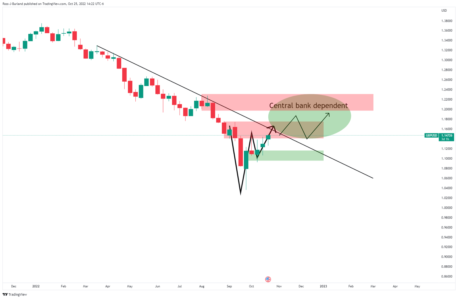 Sunak, a former banker, is more moderate than Liz Truss and had criticized many of her policies, including the unfunded tax cuts that started this whole mess. Financial markets have steadied since the country U-turned on those policies. Nevertheless, there is a mountain to climb and GBP/USD remains on the front end of a bearish trendline, as illustrated below, as traders get set for a slew of central bank meetings that kick off this week with the Europen Central Bank, Bank of Canada, Bank of Japan and conclude next month with the Federal Reserve and Bank of England. Experts are mixed on the UK’s future and there are questions as to whether the UK may be forced to ask the IMF for a bailout.