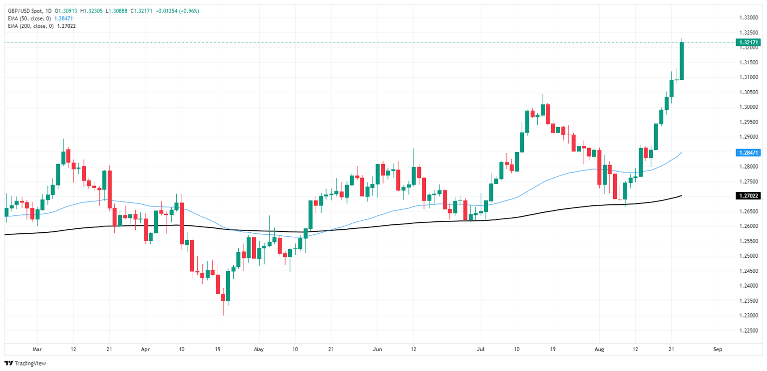 GBP/USD knocked into a fresh 29-month high on Friday, and the pair is up an impressive 28% since hitting all-time lows in 3Q 2022. Cable’s current bull run has yet to show signs of exhaustion, and the pair has closed in the green for all but one of the last 11 consecutive trading days, marking a dizzying run up the chart.