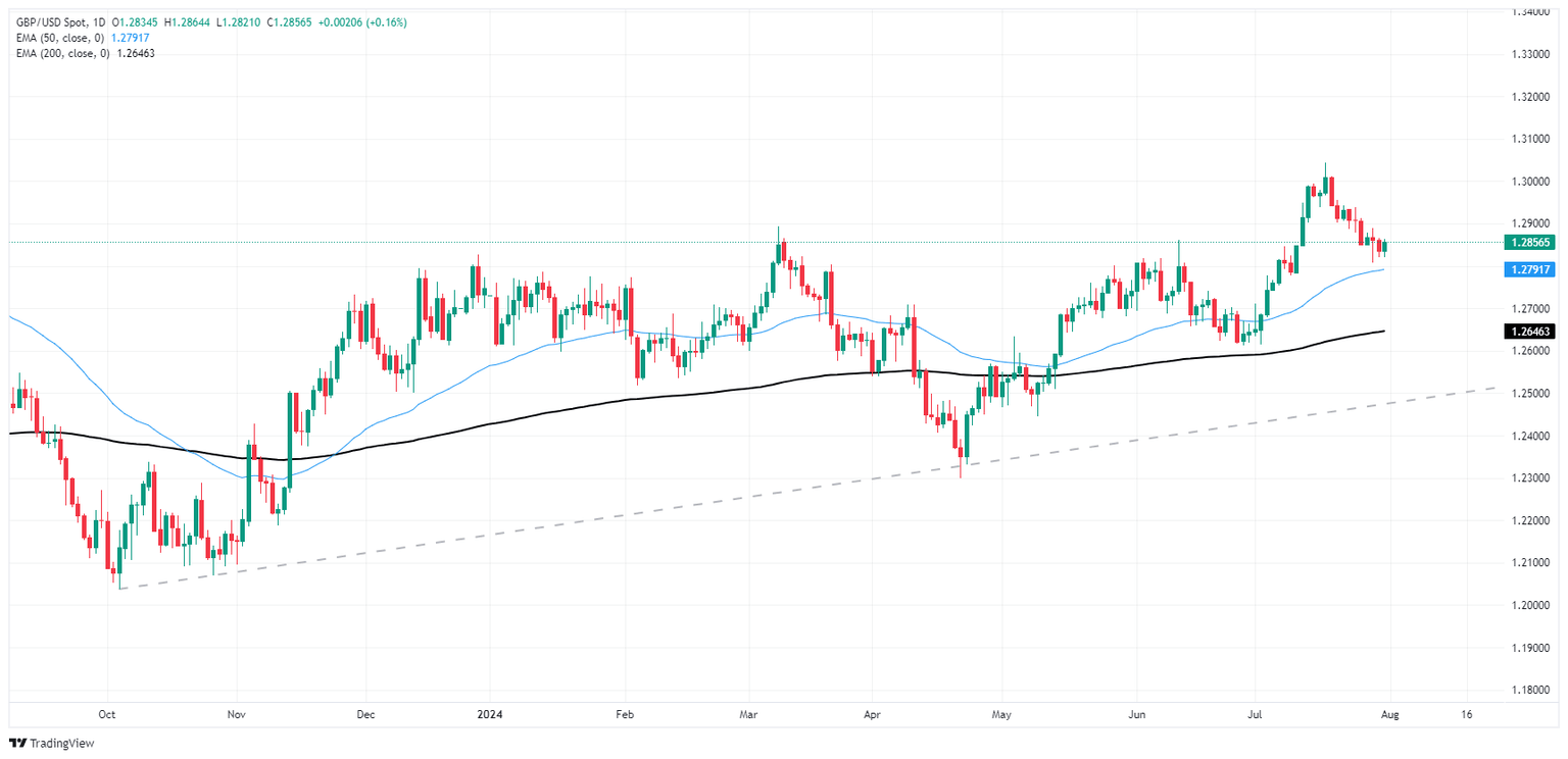 GBP/USD waffled in a near-term range on Wednesday after the Federal Reserve (Fed) hit wide market expectations of one last rate hold for July, with expectations of a September Fed rate cut fully priced in, key data pending. The Bank of England (BoE) is expected to deliver a rate cut for the first time since March of 2020, but odds-makers are expecting a close 5-to-4 vote from the BoE’s Monetary Policy Committee (MPC).
