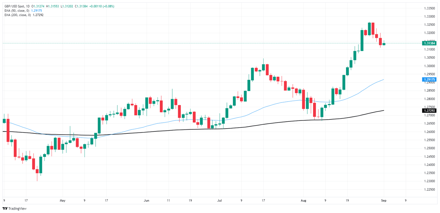 Cable has backslid from multi-month highs above 1.3250 back below the 1.3150 level as Greenback selling pressure cools, but the pair is stubbornly sticking to recent highs after vaulting to a peak 29-month bid in August. Price action is still tilted firmly into the bullish side above the 200-day Exponential Moving Average (EMA) at 1.2725, while the immediate downside technical target for shorts will be the 50-day EMA just above the 1.2900 handle.