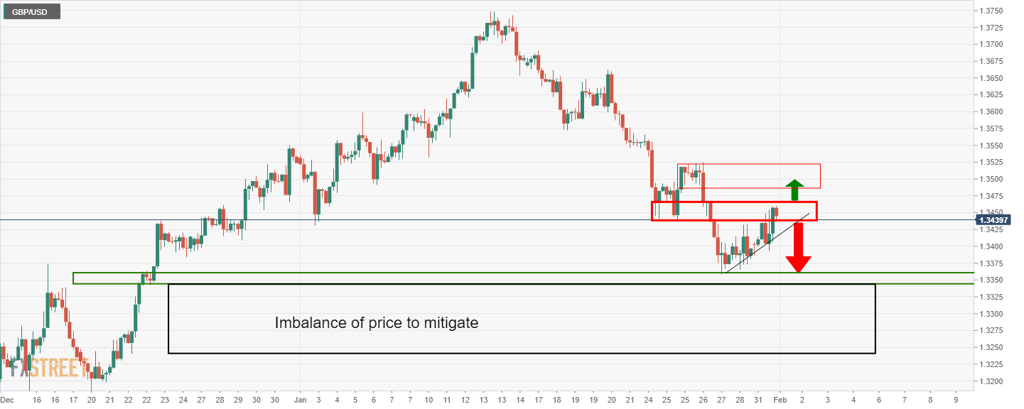 The 4-hour structure is bullish, however, and a break of 1.3450 would likely seal the deal for a run on stops around the psychological 1.35 round level.