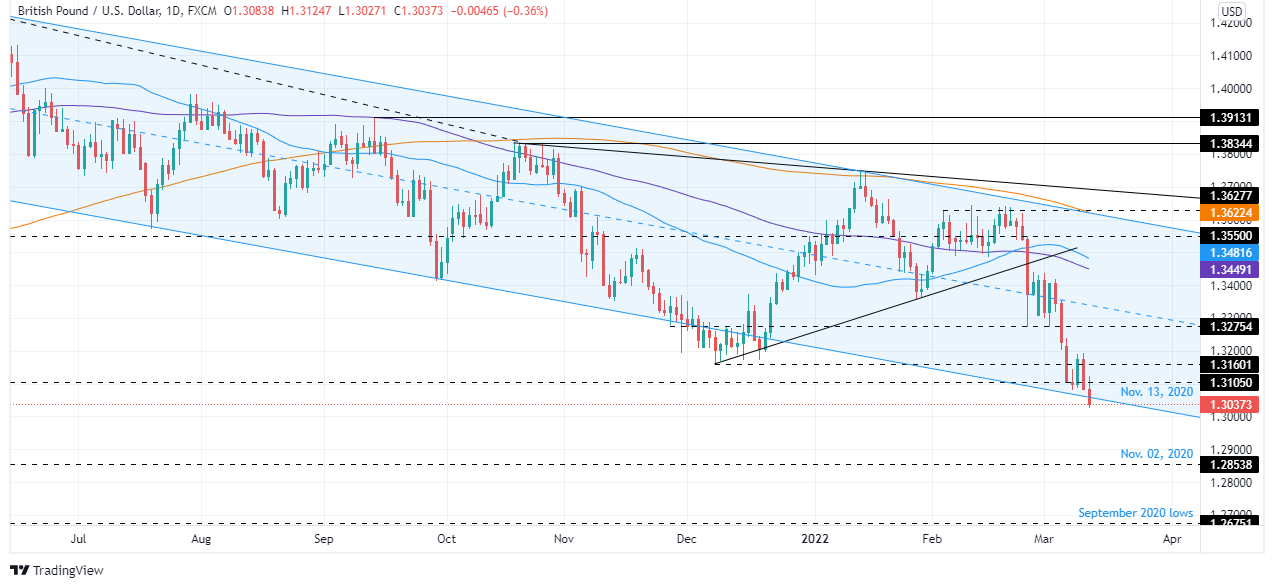The British pound heads into the weekend, set to record losses as Wall Street’s bell signals the end of a hectic week, mainly driven by market sentiment, leaving macroeconomics or, also sometimes, central banks aside. In tone with the week, Friday’s trading day fluctuated between risk-on/off, on reports from Russia saying that its President Putin seen “certain positive shifts” in talks with Ukraine, while Ukraine Foreign Minister, saying the opposite. That said, the GBP/USD is trading at 1.3035, down 0.39%.