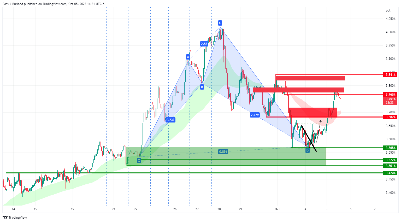 US yields rallying has helped to prop up the US dollar as the money markets price out overall optimistic speculation over a Federal Reserve pivot. The yield on the US 10-year note was up a high of 3.78%.