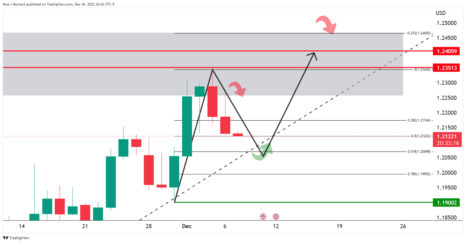 As per the prior analyses, GBP/USD bears step up the pace, eye break of 1.2150s, and GBP/USD Price Analysis: Bulls look to 1.2450 while bears eye test of 1.2100, the British Pound has continued to chip away into commitments below 1.2200 and at 1.2150. The low of the week so far has been 1.2121 and the following illustrates the prospects of a deeper correction should the bears stay the course.