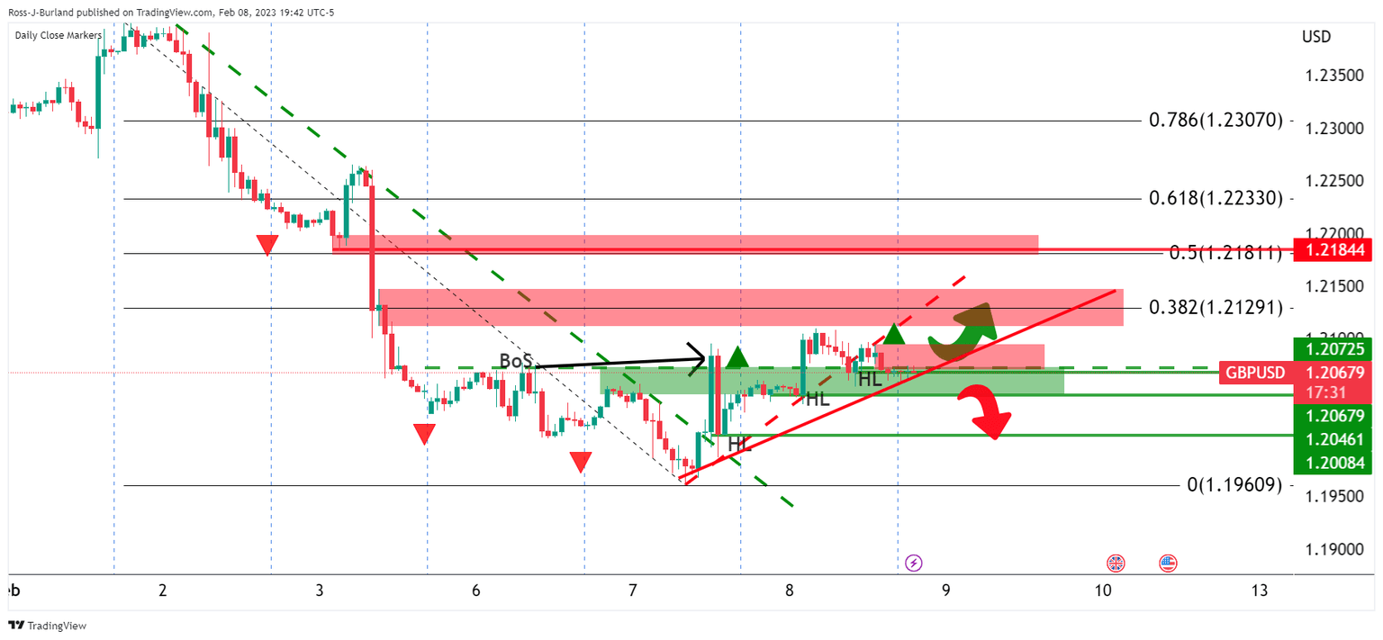 - Bulls eye a run to a 38.2% Fibonacci as a prospect for the day ahead if bulls emerge again between 1.2050/1.2010.