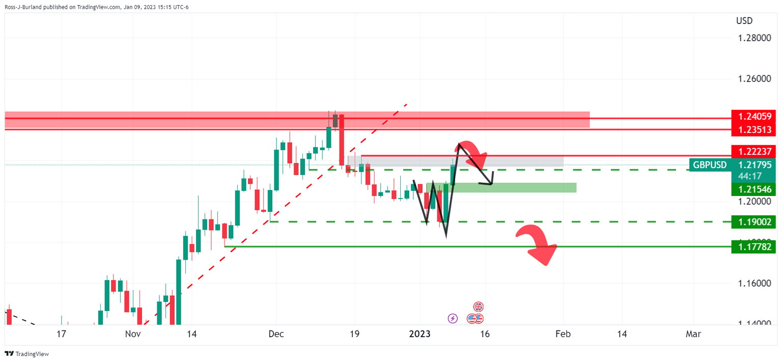 The outlook is bearish for GBP/USD while below 1.2400 and 1.2220 nearer-term highs. The following illustrates GBP/USD's W-formation and test of mid-December highs where a failure to break higher would eventuate in a bearish thesis for the days ahead.