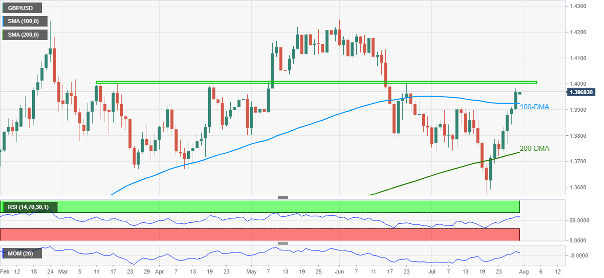 GBP/USD seesaws around 1.3970 amid early Asian session trading on Friday, after renewing the multi-day tops the previous day. The cable pair rose past 100-DMA for the first time since June 23 on Thursday amid stronger RSI and Momentum lines.