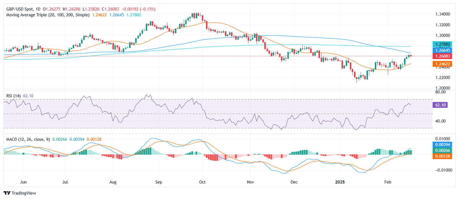 GBP/USD retreated slightly on Tuesday, edging down 0.16% to 1.2605 after an extended rally that propelled it to its highest level since mid-January. Despite this mild pullback, the broader outlook remains constructive, as the pair continues to set its sights on the 100-day Simple Moving Average (SMA) at 1.2660.