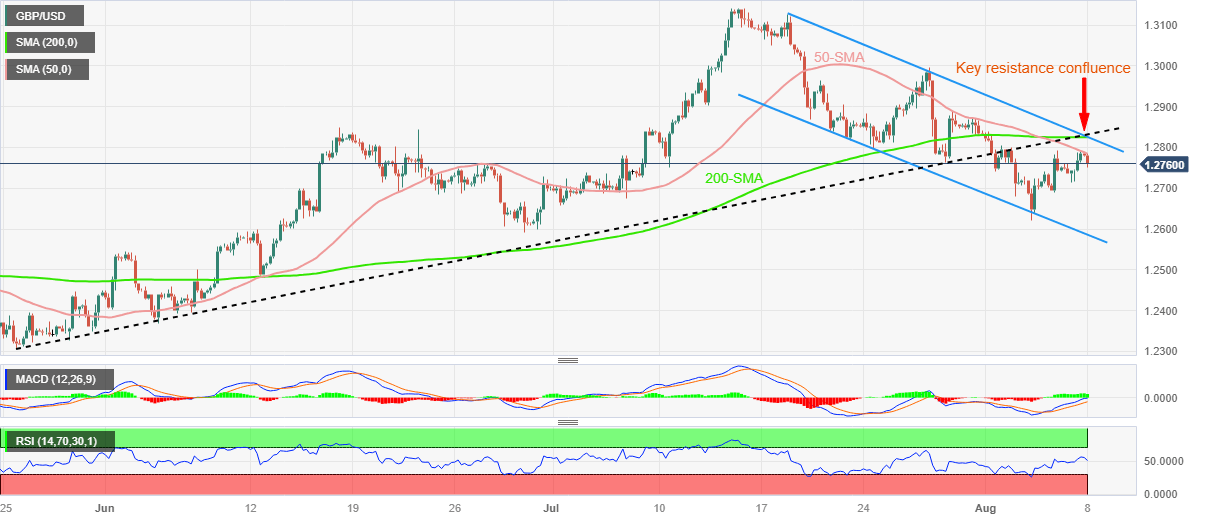 Technically, the Pound Sterling reverses from the 50-SMA hurdle of around 1.2785 as the RSI (14) line retreats. However, the oscillators remain beyond the 50 level suggesting the upbeat momentum and keeping the GBP/USD buyers hopeful amid the bullish MACD signals.