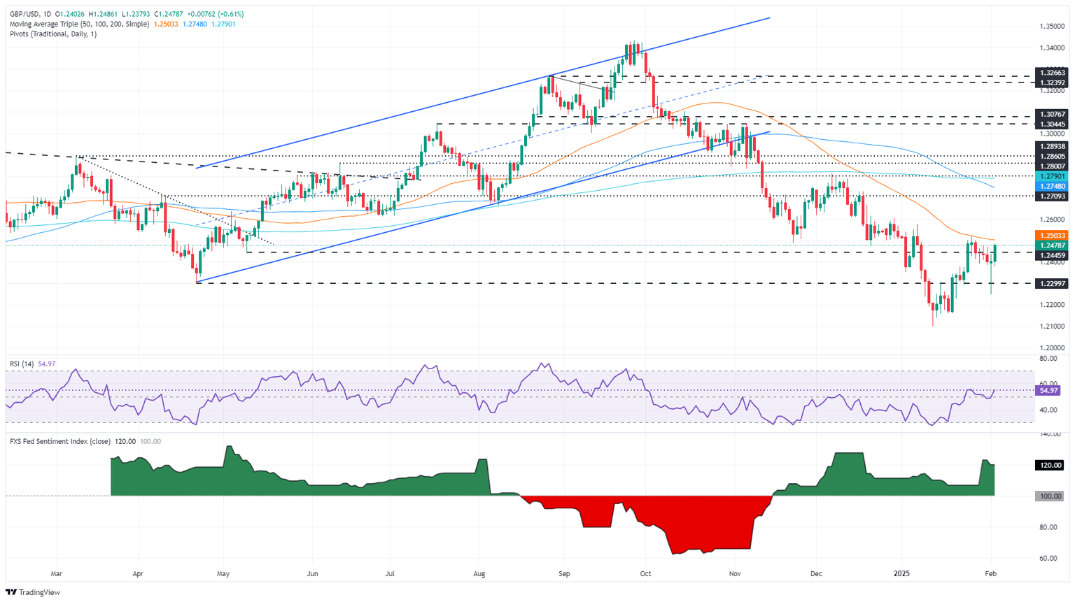 The Pound Sterling (GBP) post gains versus the US Dollar (USD) for the second straight day after US President Donald Trump tariff threats on Mexico and Canada were delayed, due to negotiations beginning between the parties, aimed to improve fighting against fentanyl traffic and illegal migration. The GBP/USD trades at 1.2476 up 0.62%.