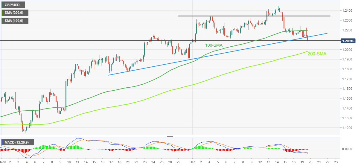 Alternatively, the support-turned-resistance line near 1.2130 and the 100-SMA level surrounding 1.2200 could challenge GBP/USD bulls.