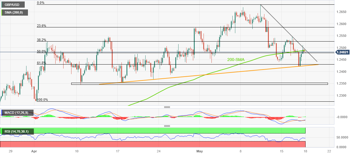 In doing so, the Pound Sterling takes a U-turn from the convergence of the 200-SMA and a downward-sloping resistance line from May 10, close to 1.2490 at the latest. Adding strength to the pullback moves are the steady RSI (14) line and sluggish MACD signals.