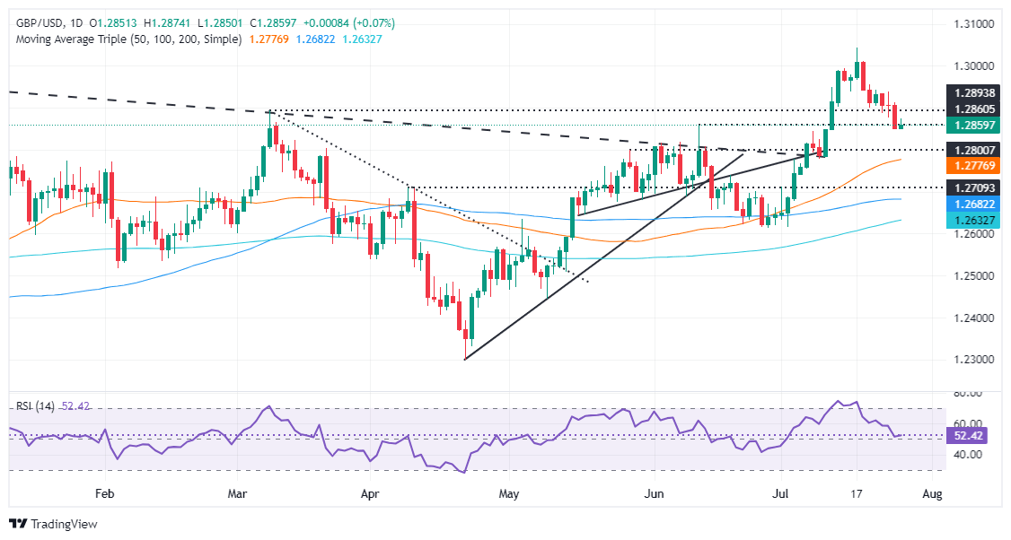 The GBP/USD consolidated at around 1.2850 after sellers strengthened and pushed the exchange rate past the 1.2900 figure, which was unsuccessfully cleared during the first three days of the week. Despite this, momentum is still in buyers' favor, as depicted by the Relative Strength Index (RSI), though extremely long positions on Sterling could leave traders vulnerable if the Bank of England (BoE) cuts rates next week.