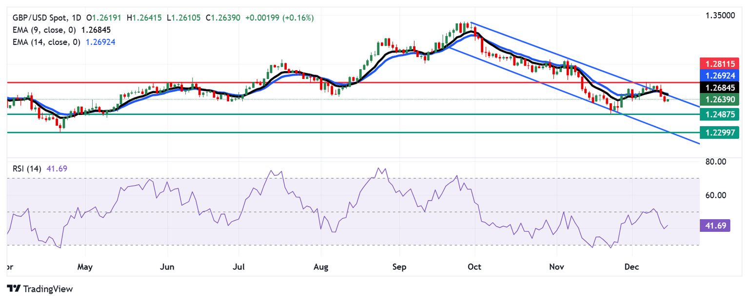 The GBP/USD pair may find initial resistance around the descending channel’s upper boundary, aligned with the nine-day EMA at the 1.2684 level. A break above this level could weaken the bearish sentiment and support the pair to explore the area around its five-week high of 1.2811 level, marked on December 6.