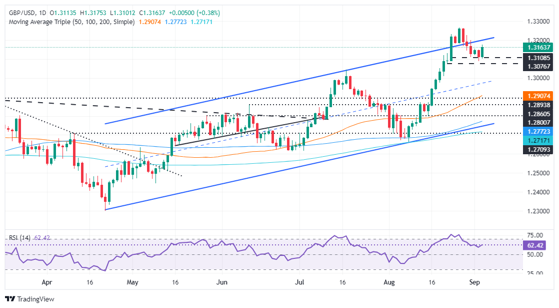 The Pound Sterling enjoys a good rebound off the weekly low of 1.3087 and rises in early trading on Wednesday during the North American session, climbing over 0.22% against the Greenback. Soft US jobs data increased the odds of a 50-basis points rate cut by the Federal Reserve and underpinned the GBP/USD higher, trading at 1.3163.