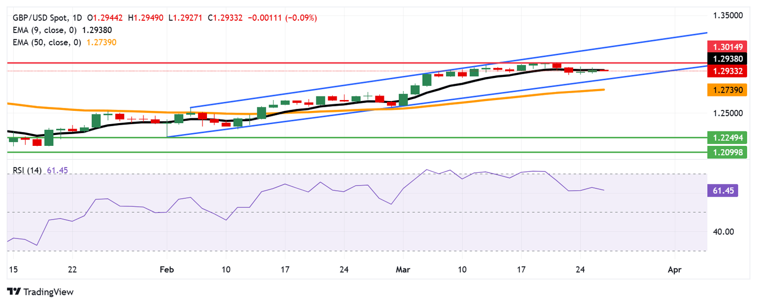 The GBP/USD pair is testing an immediate barrier at the nine-day EMA at the 1.2938 level. A rebound above this level could revive the short-term price momentum, followed by the four-month high at 1.3014, recorded on March 20. Further advancement could reinforce the bullish bias and support the pair to test the ascending channel’s upper boundary near 1.3170.