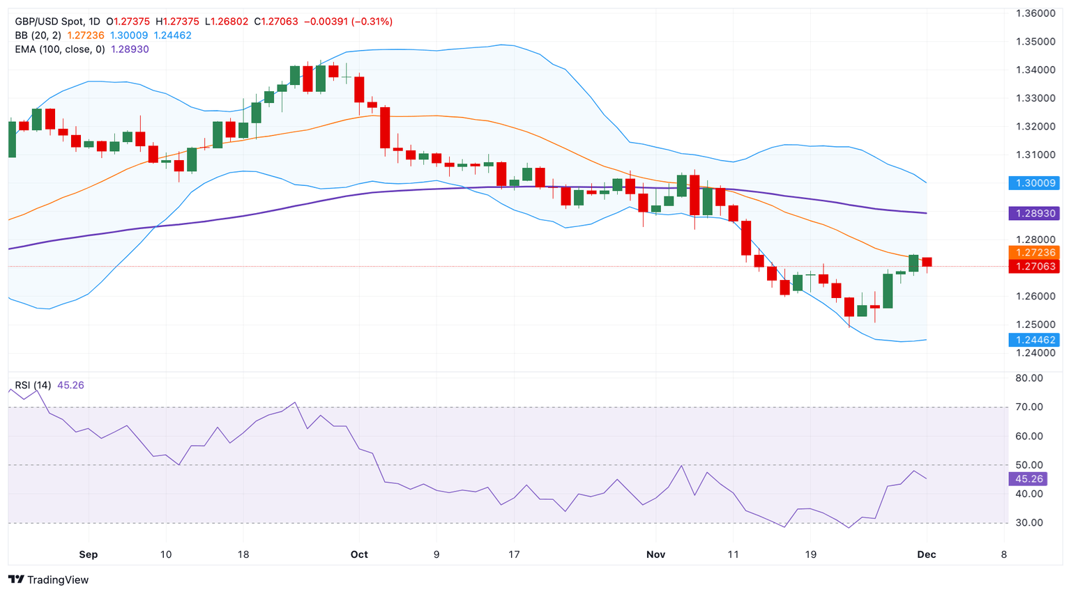 On the bright side, the first upside barrier is located at 1.2834, the low of November 6. Extended gains above this level could pave the way for a test of the 1.2890-1.2900 zone, representing the round mark and the 100-day EMA. The psychological level and the upper boundary of the Bollinger Band of 1.3000 appear to be a tough nut to crack for bulls.