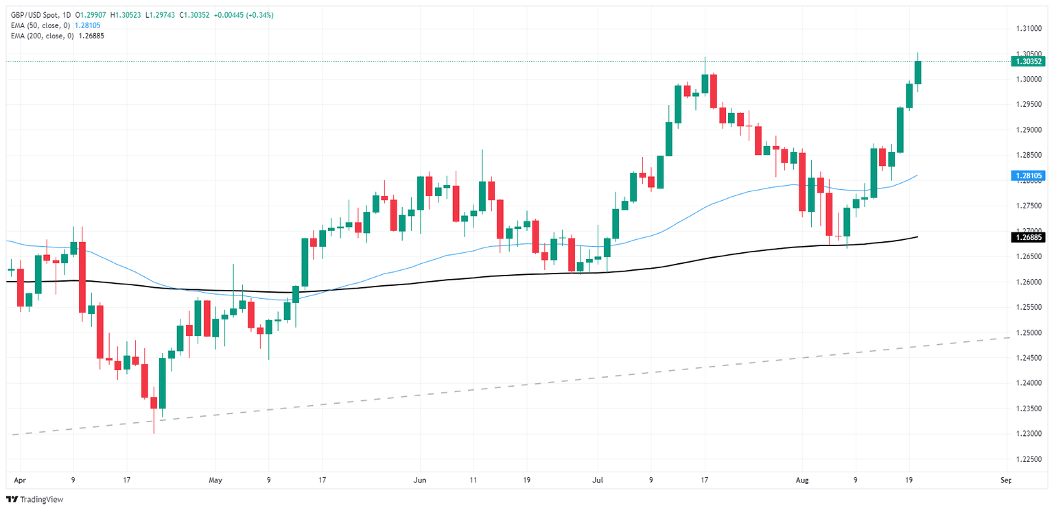 GBP/USD chalked in another third of a percent gain on Tuesday, squeezing out a fresh 13-month high and closing in the green for a third straight day as the Pound Sterling capitalizes on broad-market Greenback weakness. Market sentiment is holding on the high end ahead of key business activity survey results, and the upcoming kickoff of the Jackson Hole Economic Symposium.