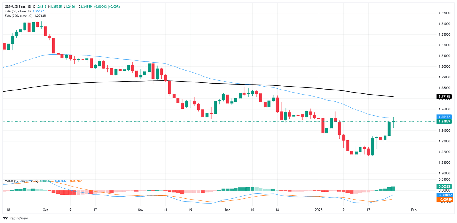 GBP/USD has beaten footprints into the charts on both sides of the 1.2500 handle on Monday, chalking in an intraday high above 1.2520 before pivoting back into the low side near 1.2480. With price action getting hung up on tech levels just south of the 50-day Exponential Moving Average (EMA) at 1.2517, bids are at risk of pricing in a near-term ceiling and giving bears a foothold in the daily charts.
