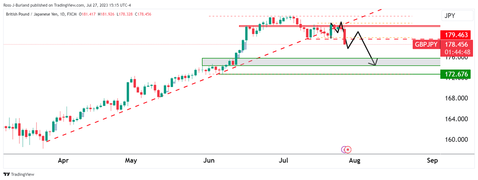 However, that narrative has flipped in New York trade on Thursday and USD/JPY fell from 141.10 to a low of 139.09 when the Nikkei reported '' the Bank of Japan will discuss tweaking its yield curve control policy at a policy board meeting Friday to let long-term interest rates rise beyond its cap of 0.5% by a certain degree, Nikkei has learned, in what would be a shift toward a more flexible policy approach.'' Consequently, GBP/JPY has been dragged deeper below trendline resistance as follows: