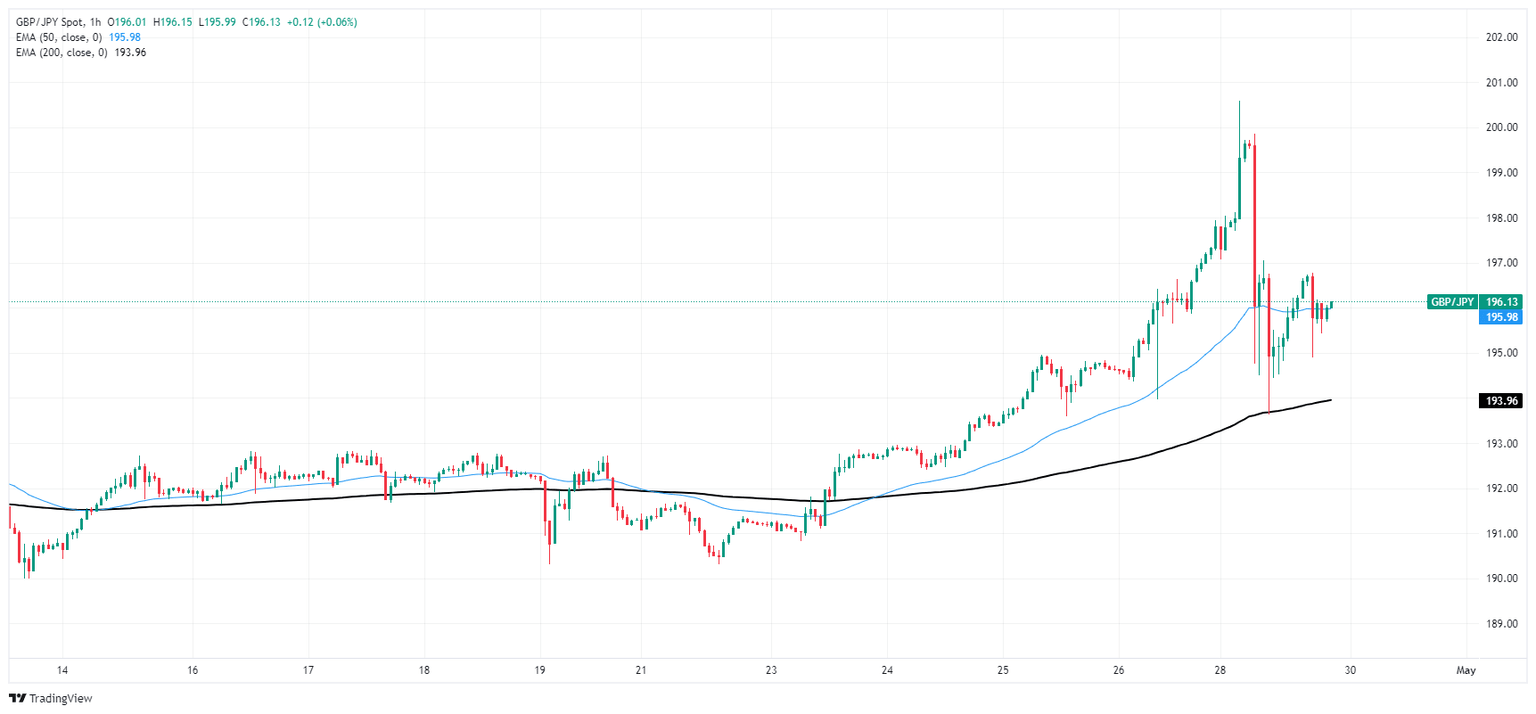 GBPJPY settles near 196.00 after volatile Monday, falls back from 34-year high