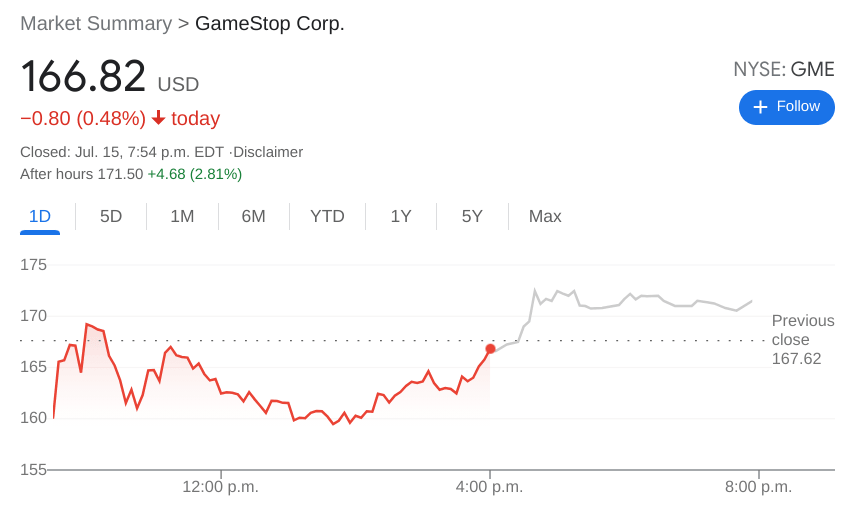 NYSE:GME extended its decline on Thursday as the stock has now fallen during every session this week. Shares of GameStop dropped 0.48% and closed the trading day at $166.82, after recovering some of its morning losses at the closing bell. GameStop has rebounded slightly in after hours trading with the stock up nearly 3% at the time of this writing. It has been a downward spiral for GameStop following the second short squeeze event in June, having now lost 27% over the past month.